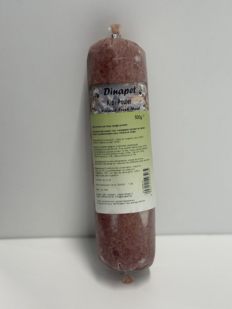 De Dinapet barf kip zijn worsten die uit 15% fijn gemalen botten, 70% vlees en 15% organen bestaan.